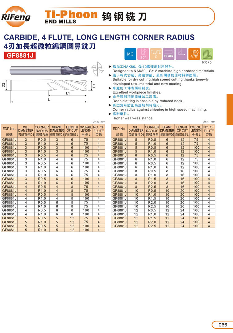 9. 4刃超微粒圓鼻鎢鋼立銑刀065