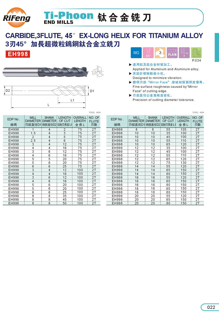 2. 3刃加長鈦合金立銑刀022