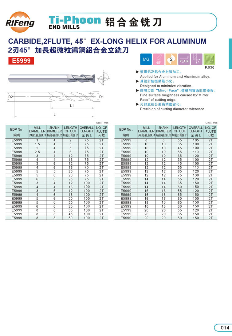 1. 2刃鋁合金銑刀 013