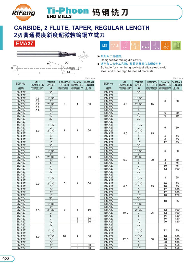 15. 2刃超微粒鎢鋼斜度立銑刀024