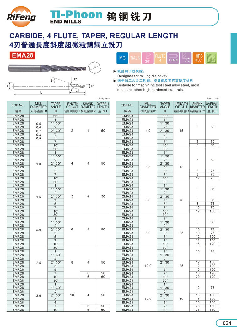 16. 4刃超微粒鎢鋼斜度立銑刀024