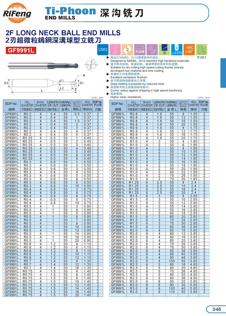 2刃球型超微粒鎢鋼深溝立銑刀046